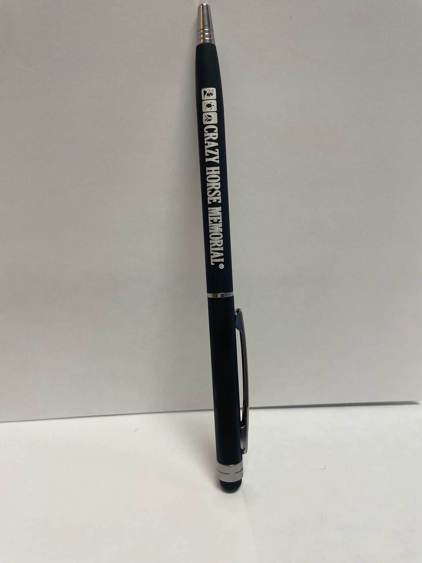 Metal twist pen featuring touchscreen stylus tip that works on virtually any current mobile device. Elegant slim fit in your hand. Black ink