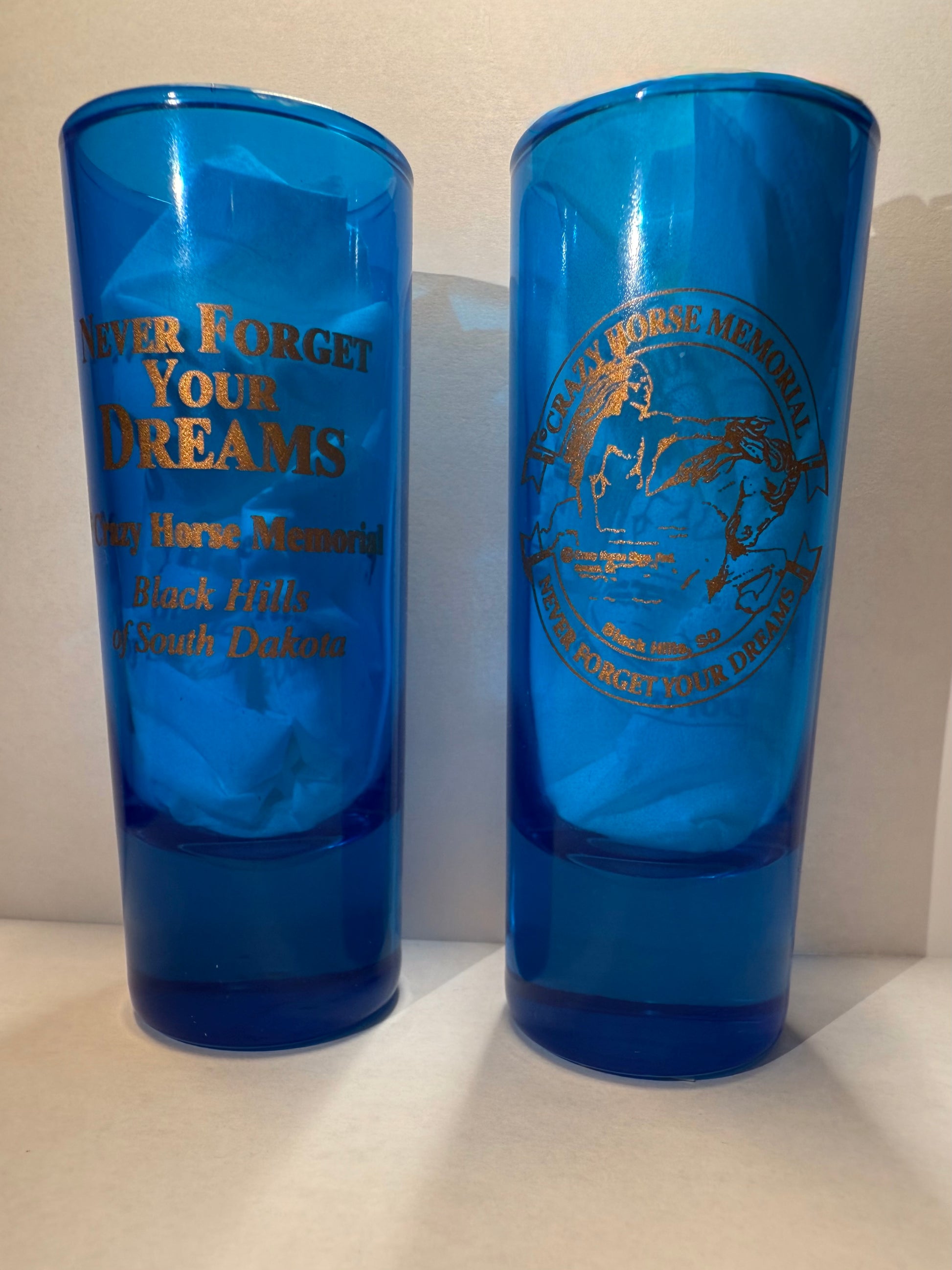 A beautiful blue mini-vase with our Crazy Horse Memorial® logo on one side and one of Korczak's favorite sayings "Never Forget Your Dreams®" on the other. Both in gold lettering. 4" tall. Made in the USA.